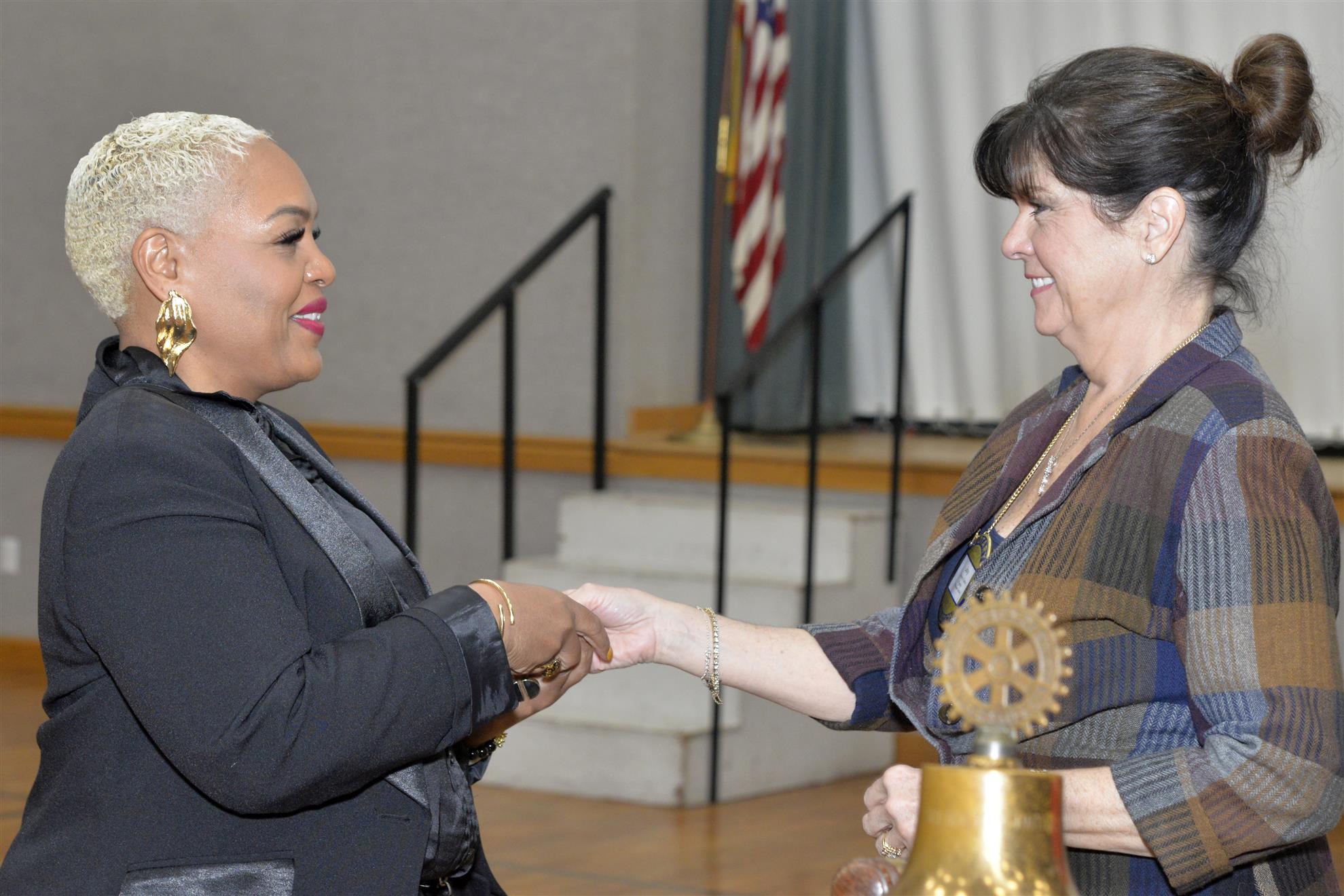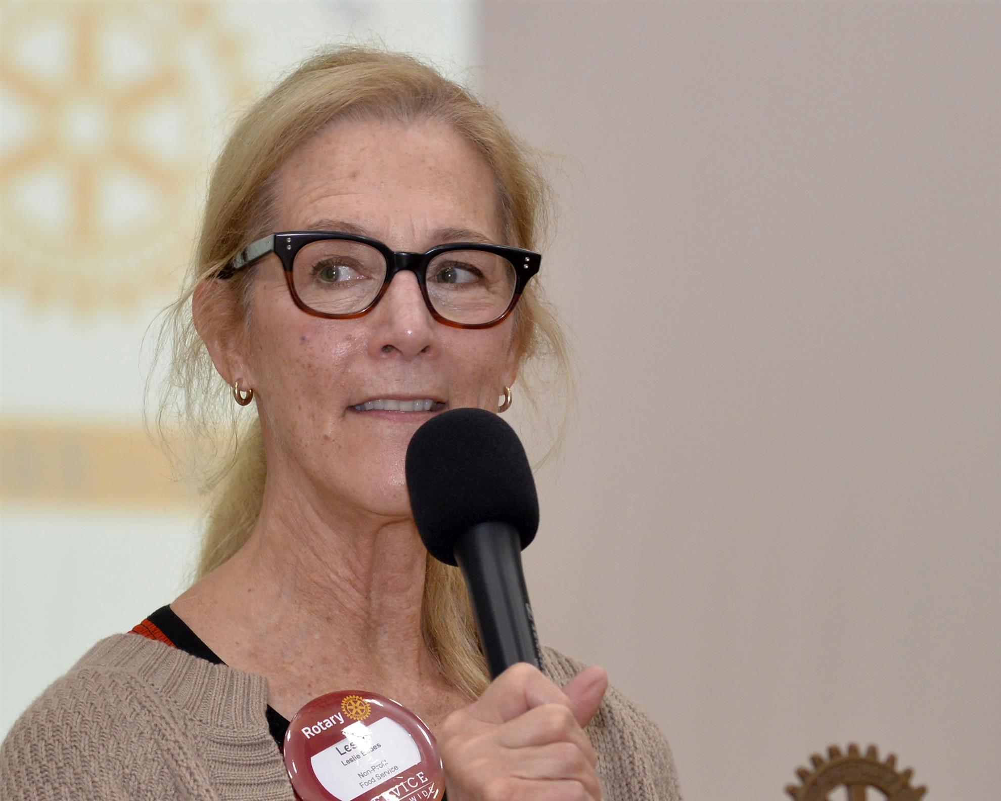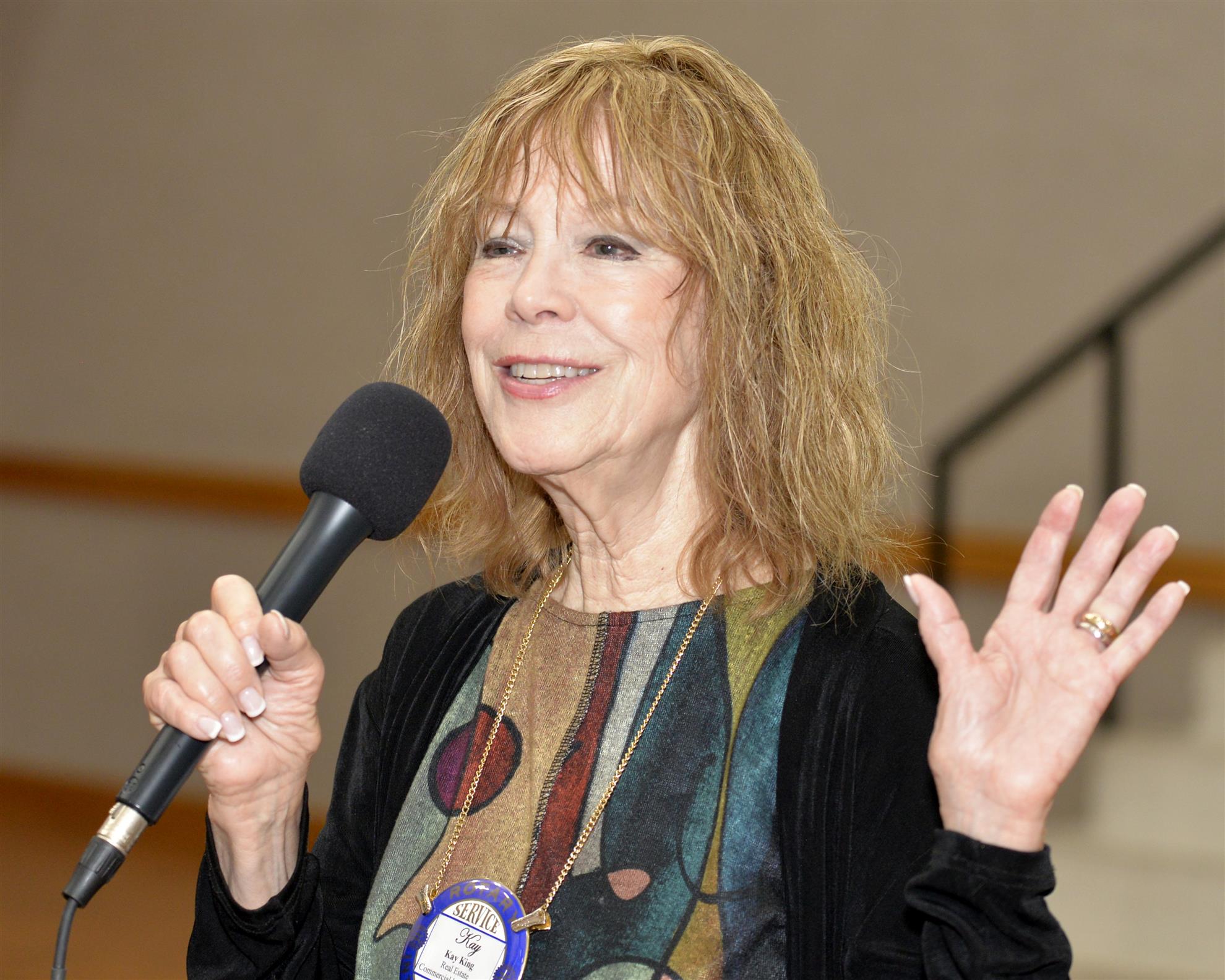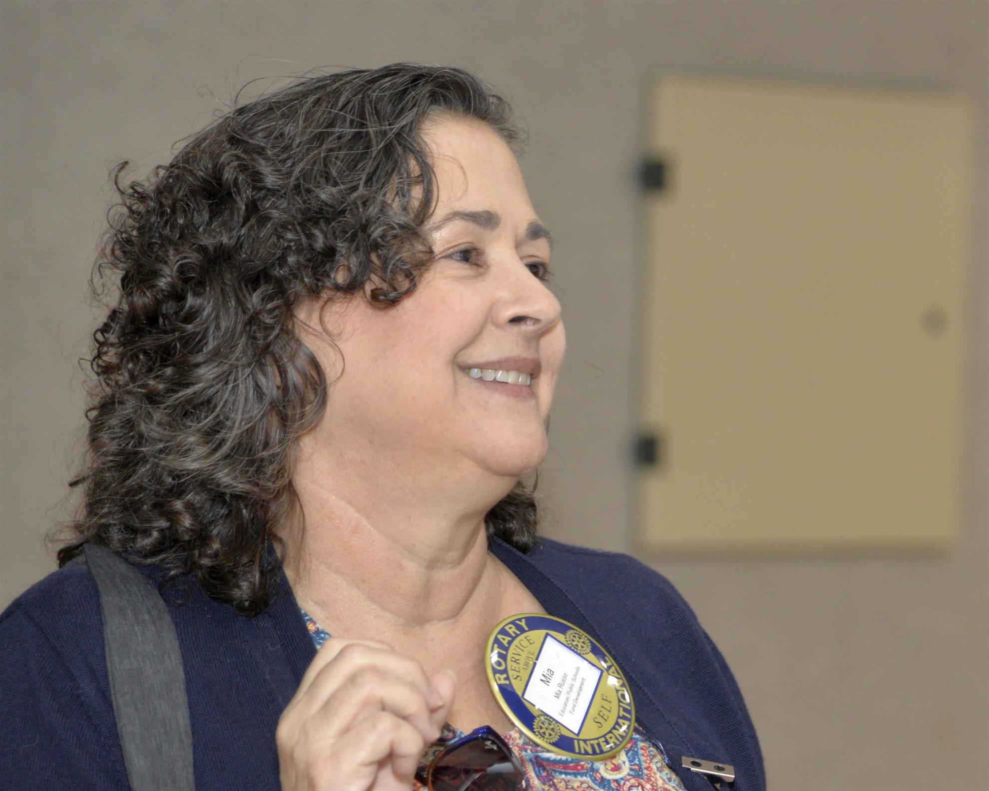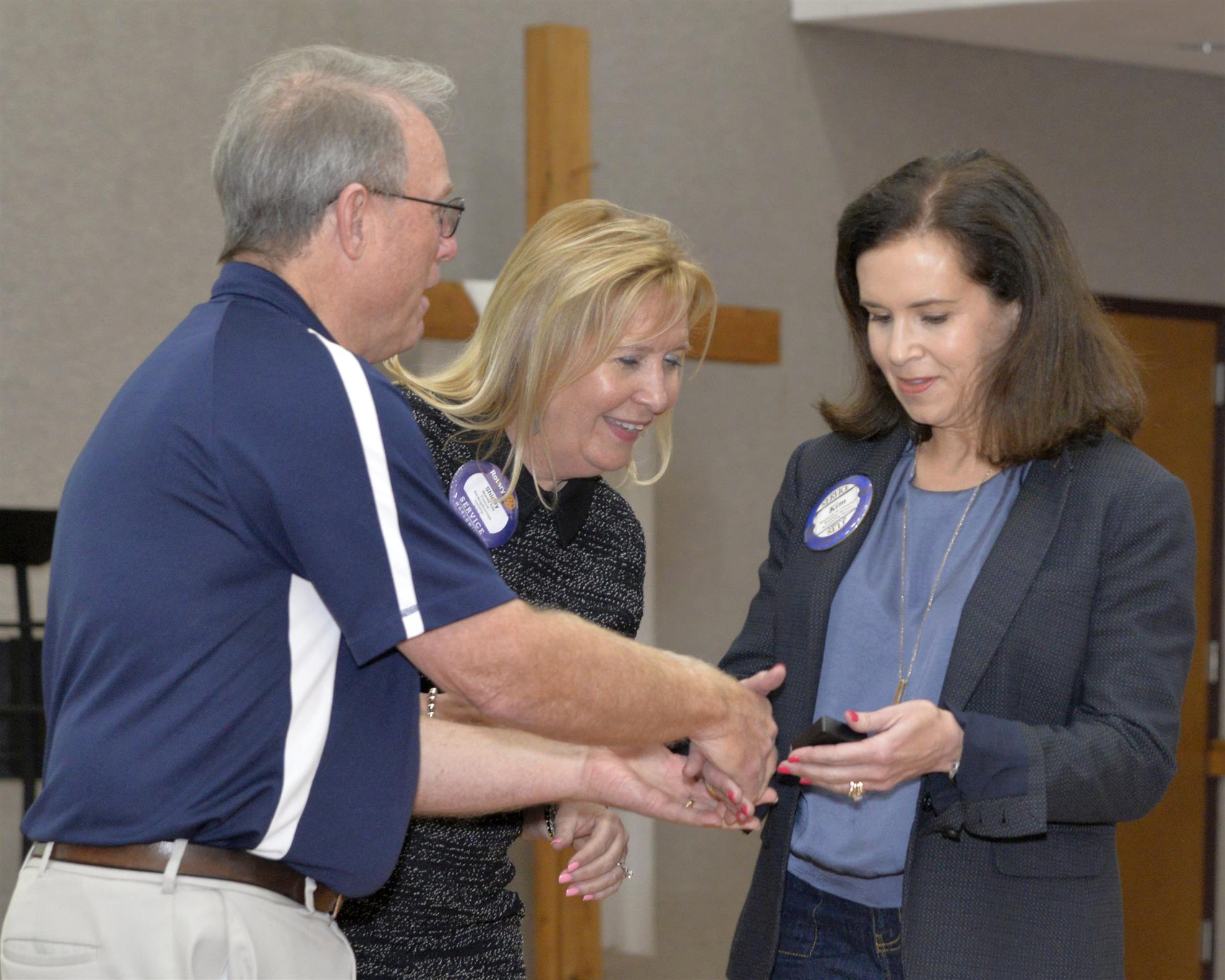 Next up, Joy Bates presented Kendra Mobley with her Blue Badge. Vera then called on Sally Hopper and Kurt to present several Paul Harris Awards. Kurt presented Jill Regina her Paul Harris +4 pin. Jill had actually received recognition 2 weeks ago, but Kurt forgot the actual pins at home that day. Sally presented Shirley Cox with a Paul Harris +2 and Kim Crawford with a Paul Harris +6. Before handing the pins to the recipients, Sally gave a short history of the award and its namesake.