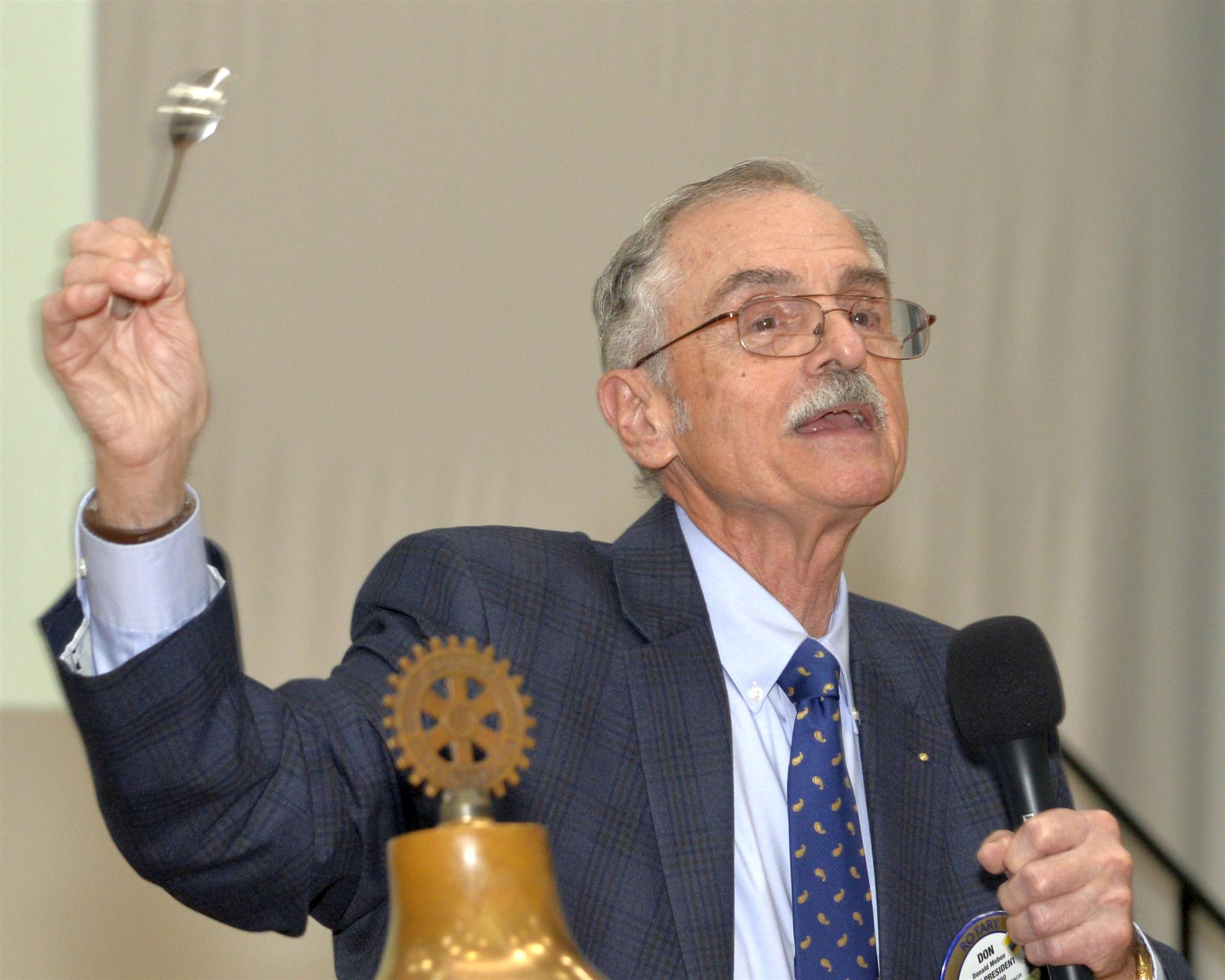 Vera called Peter Scott to the podium and he began looking for a special guest who apparently hadn’t yet arrived. Just in the nick of time, as if on cue, current District Governor Andy Eades strode into the hall and was handed the microphone (therefore saving us from one of Peter’s lengthy discourses). Andy praised our club and the work we do, and then he called up to the front the aforementioned visiting DG’s as well as our own past DG’s, Peter and Don. That made for quite an impressive line-up of Rotarians. As he elaborated on the virtues of Rotarians, he announced…(drumroll please)…Kurt Bartley as next in line for District Governor! He mentioned how deserving Kurt was and specifically noted that he has a servant’s heart and a vision for the future of Rotary. Kurt spoke briefly and thanked everyone for their support over the past several years as he has gone through this process and he will need continued support in his upcoming duties. The third time really was the charm.