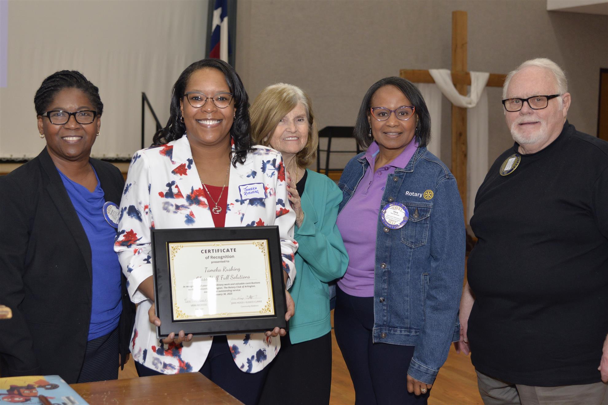 Eunice Currie and Jean Hood presented a Minority Business Award to Tameka Rushing of Glass Half Full Solutions. Beyond professional development, the organization supports city events and initiatives, empowers leaders, unites teams and plays a vital role in Arlington’s growth as a dynamic and inclusive community. Tameka’s business focuses on new emerging leaders and business owners with personalized development plans.