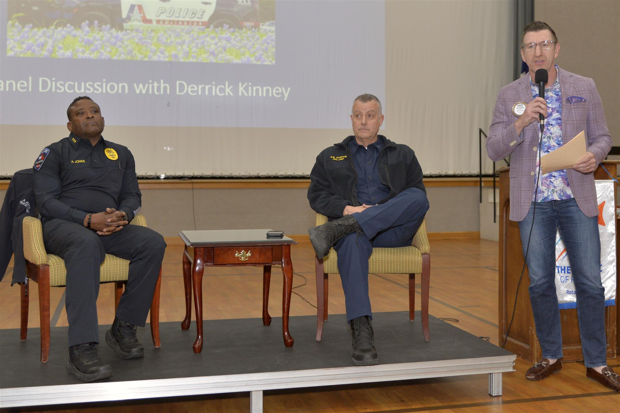 Randy introduced the program for today’s meeting – a panel with the safety chiefs representing both the Arlington Police Department and the Arlington Fire Department. Impresario Derrick Kinney served as moderator for the program.