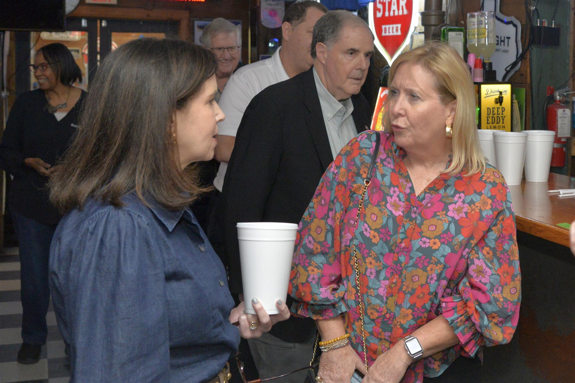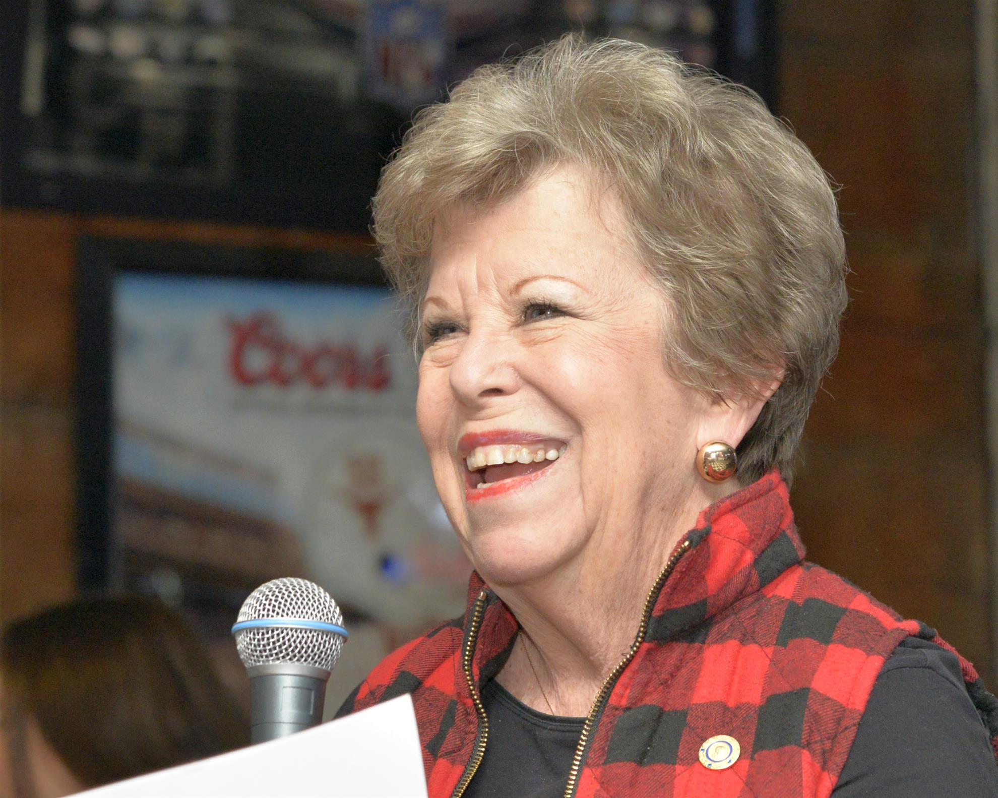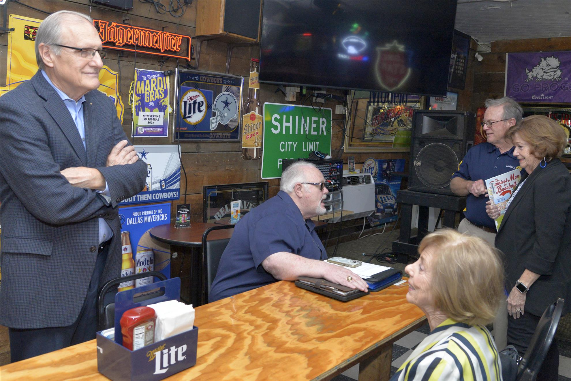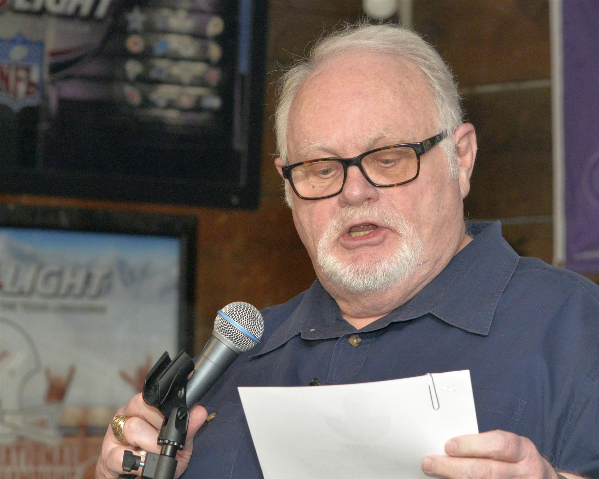 The meeting was held at J. Gilligan’s Bar. President Vera McKissick tried to get people’s attention to call the meeting to order. No one appears to hear her. Vera suddenly broke into French. While I do not speak French, I like to imagine that she cursed us all as infernal coxcomb buggers. Still, no one appeared to notice Vera’s haranguing of the gathered Rotarians. Finally, Vera brought out her “teacher voice” and yelled as us. This settled down the crowd and Vera was finally able to call the meeting to order.